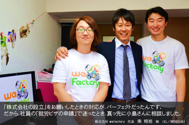 회사 설립도 직원의 취업비자도 코지마씨에게 신세를 많이 졌습니다. 앞으로도 저희 직원이 늘어날 때마다 부탁을 드리고 싶습니다. 잘 부탁 드리겠습니다.