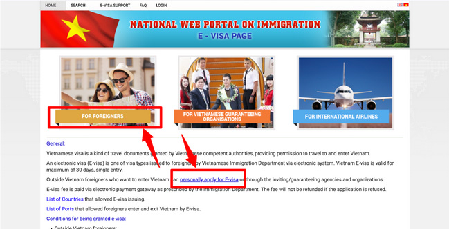 - 3. 「FOR FOREIGNERS」または「personally apply for E-visa」をクリックします。